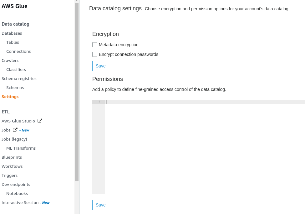 In the AWS console in account B, go to Glue > Settings, and add the following permissions: