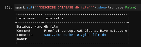 You can describe a database by running spark.sql("DESCRIBE DATABASE db_film")